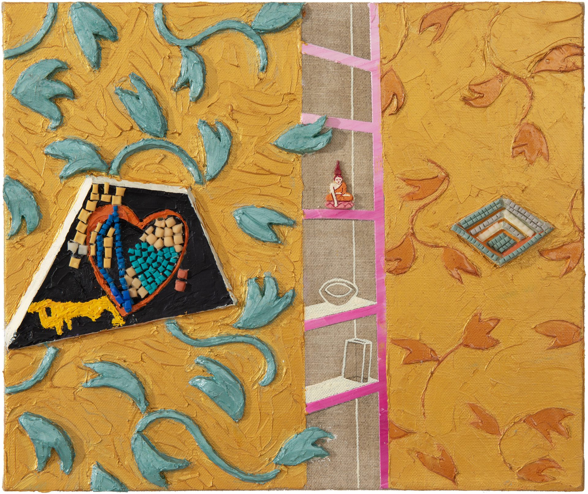 Nomi makes chooses to paint five nude women. Each one of them is sought out for the project with precision. They (Neta, Nomi B., Vered and Yana) are all connected to Nomi and the art world in different ways – some of them have been  her friends for many years.  The women aren’t necessarily experienced models, but women whose nudity in front of the artist is not obvious. For these women this is a new experience with the feminine gaze observing their body, with making their bodies present on the canvas. The outcome of this painted female nudity isn’t disturbing. They appear at ease, devoid of sexual tension, different from one another. Their nakedness is the center of the painting but it is surrounded by a rich and colorful composition that nearly “steals the show”: clothes, textiles, patterns, furniture – a feminine studio environment with colorful richness, painted in detail. The structure of the composition, perceiving and containing the painted figure simultaneously also conveys a feminine perspective on female nudity.  This setting – with its rounded perspective and its extremely rich details – enables the viewer a tender investigation of the painted woman, of feminine nudity, and of the difference between the women. (This may be due to their body structure, to their sitting position or to what is hidden or exposed).